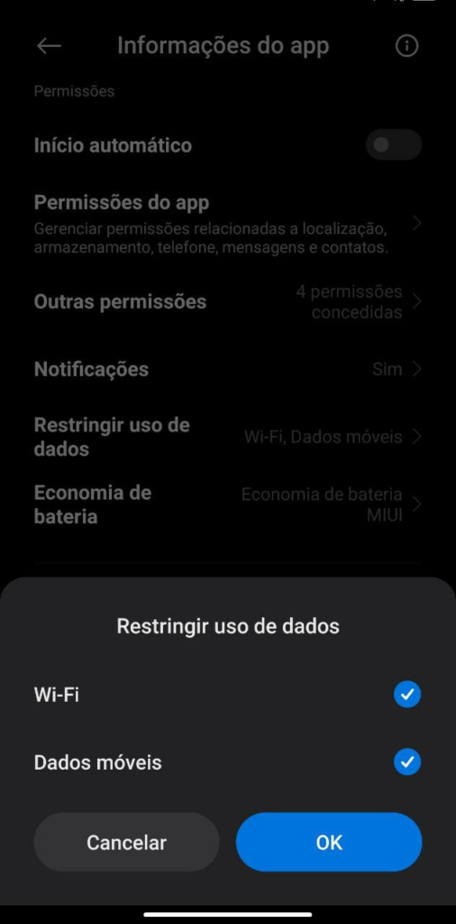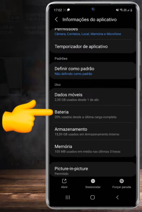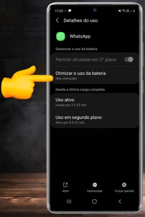 Nesta etapa marque a opção ‘PERMITIR ATIVIDADE EM 2º PLANO‘ e desative a otimização de bateria, conforme mostram as imagens abaixo.