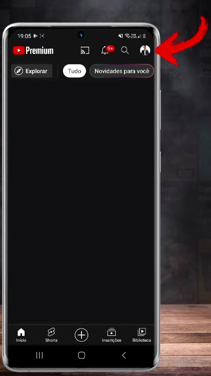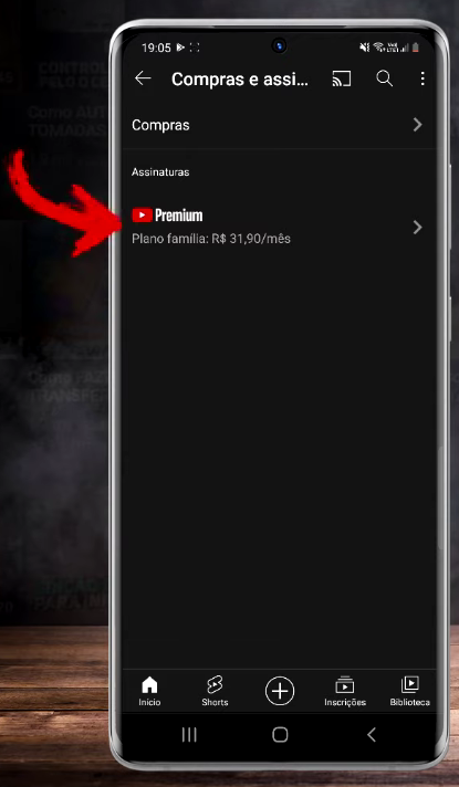 Abra o aplicativo do YouTube e no canto superior direito toque sobre o ícone do seu perfil, em seguida vá até ‘COMPRA E ASSINATURAS‘ e pressione sobre sua assinatura do YouTube Premium referente ao pacote família. Veja: